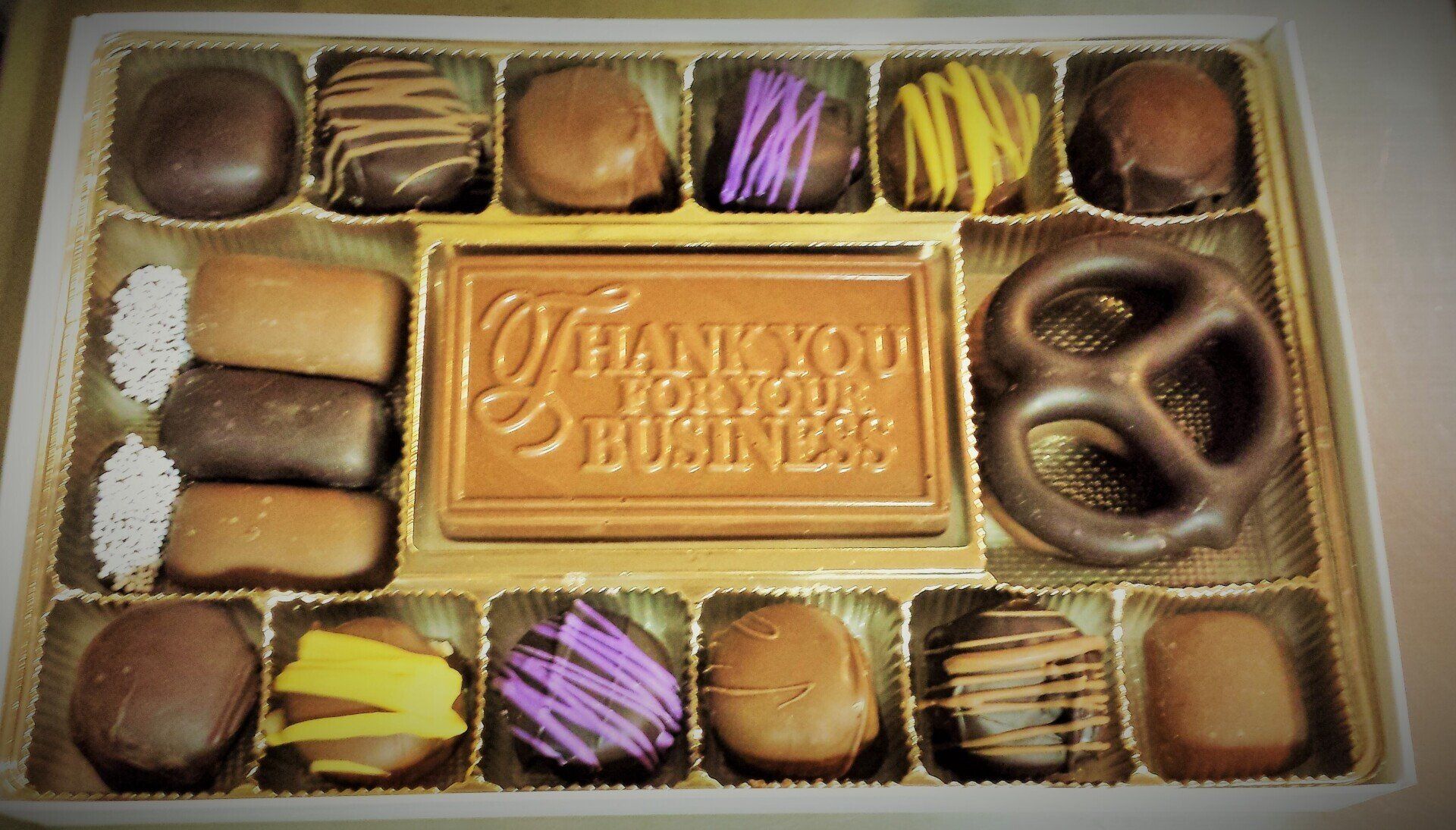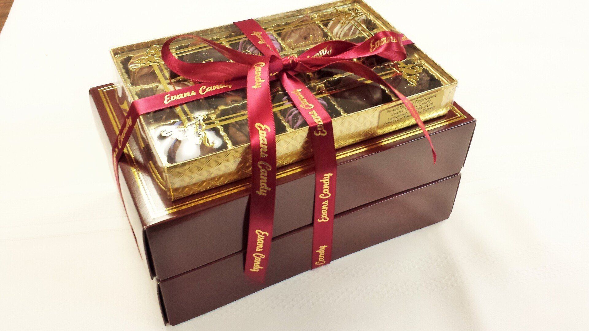 We can provide boxes in a variety of shapes and sizes printed with any message or logo. Fill them with chocolates of your choice. (Minimums required for box printing.)